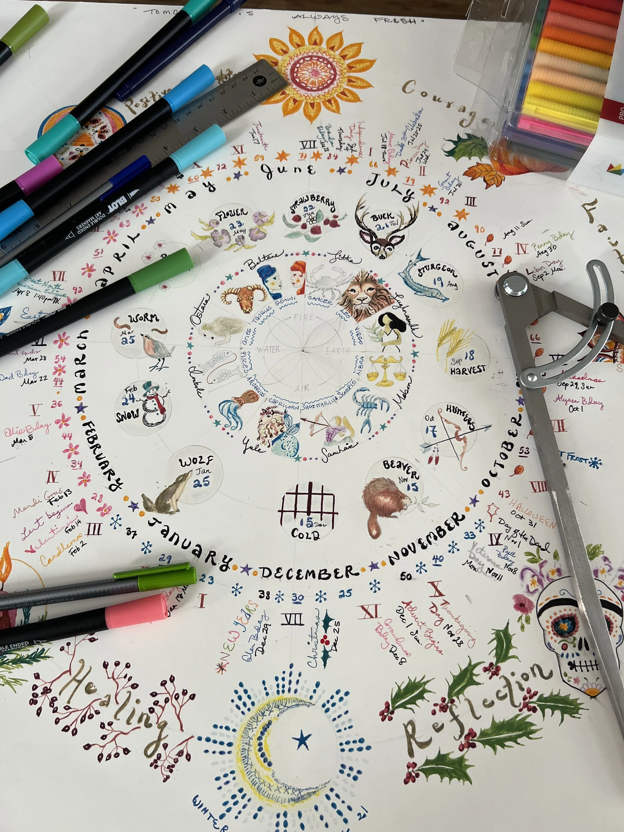 Your Vision Wheel will be personalized with your upcoming benchmarks: birthdays and events, holidays, intentions and goals, gardening schedule, astrological phases, religious festivals and so on.
